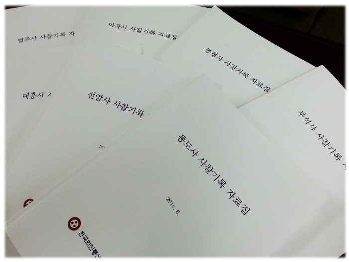이번 조사는 2015년 4월부터 2016년 5월까지 추진위원회 사무국에서 진행하였으며, 자료집은 각 사찰 총 7권으로 구성되었습니다.
